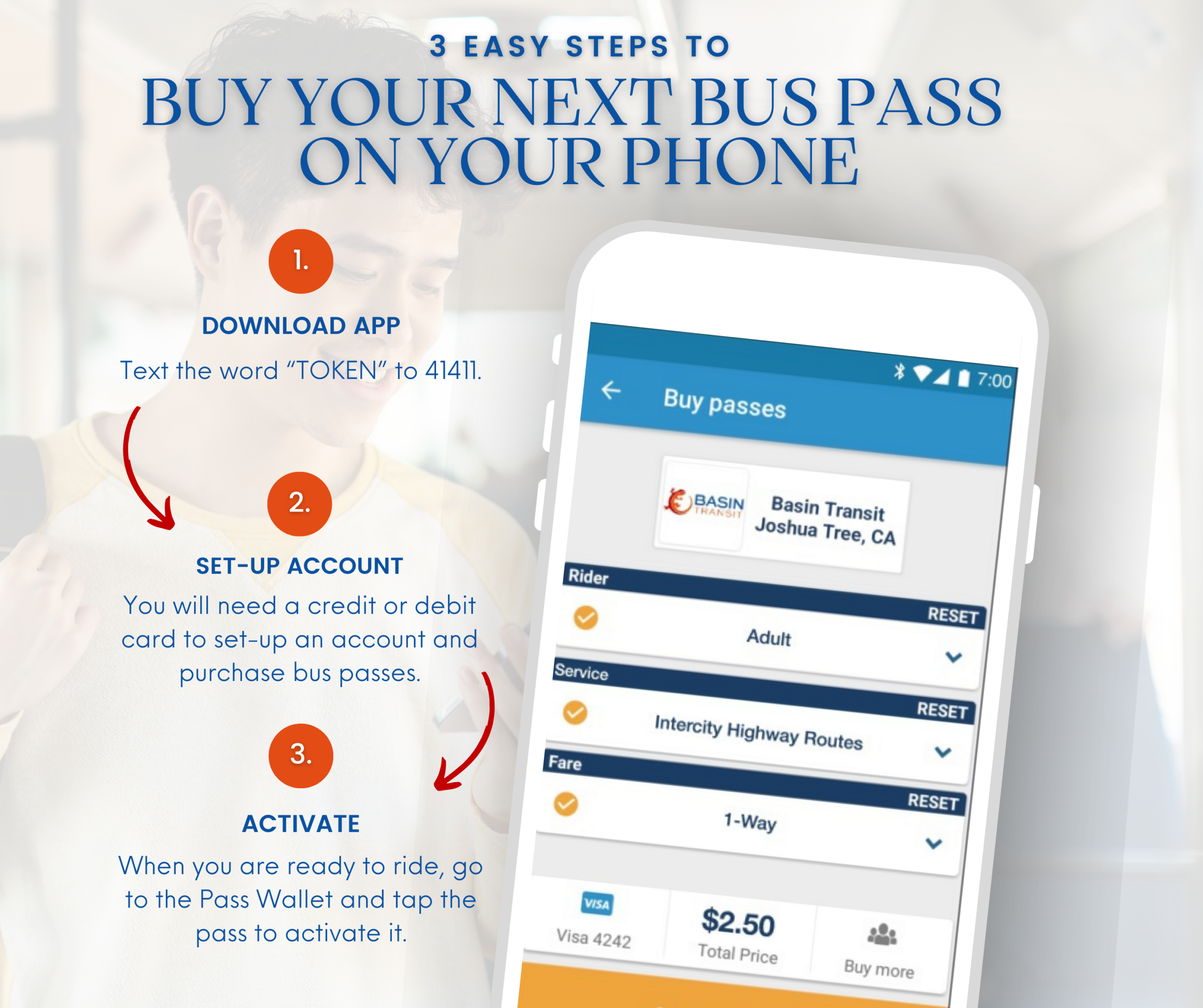 Pay for your Basin Transit fare quickly and easily with your phone using the Token Transit app. This easy-to-use app allows riders to purchase passes ahead of time and have them on their phone when they are ready to board the bus. Click here for Token Transit instructions.