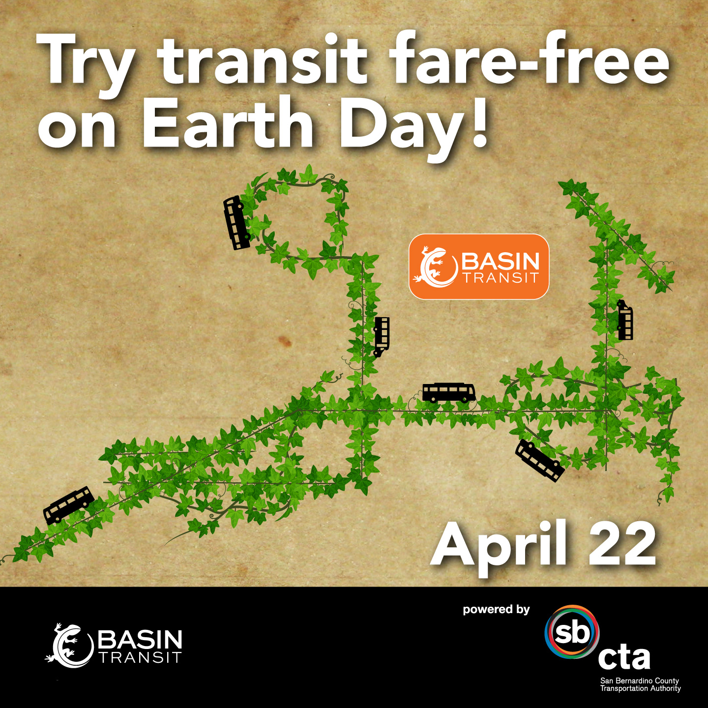 FREE FARES ON EARTH DAY Posted on April 15, 2026 by Cheri Holsclaw This Earth Day, your ride is on SBCTA! Ditch the car, grab a seat, and enjoy FREE fares all day on Wednesday, April 22nd! Less traffic, cleaner air, and a greener planet—sounds like a win-win!